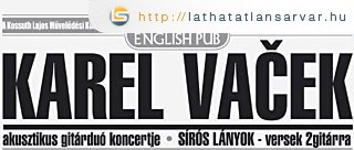 A Karel Vacek duó tagjai szeptember 24-én, 21 órakor saját megzenésített verseiket adják elő a Club 63 English Pubban. A melankolikus, költői igényű szövegeket melankolikus „költői” igényű nejlongitározás kíséri. Az összeszokott, igazi baráti köteléken alapuló duó tagjai másutt is zenélnek: Wettstein Tamás a Praha http://praha.zalaszam.hu zenekar gitáros, énekese, Podhorszky Gábor http://pgmusic.extra.hu pedig a klasszikus zene kiváló hírnöke, jelenleg a Hágai Királyi Zeneakadémián folytat posztgraduális tanulmányokat. Köteteik megvásárolhatók a koncert után.